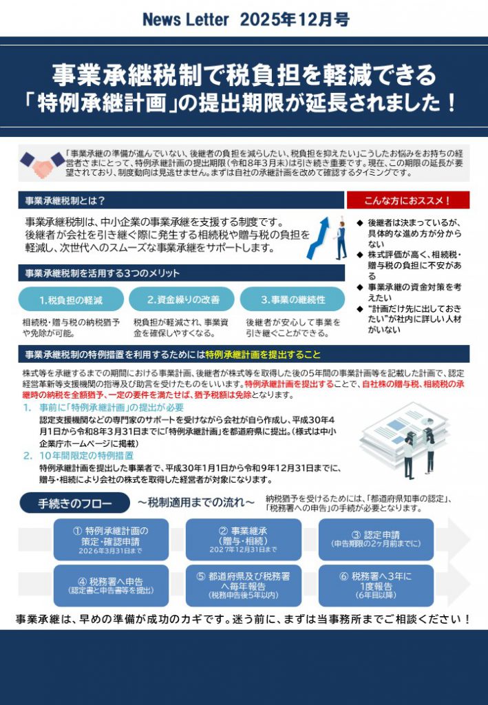 特例承継計画の提出期限(令和8年3月末)は引き続き重要です。